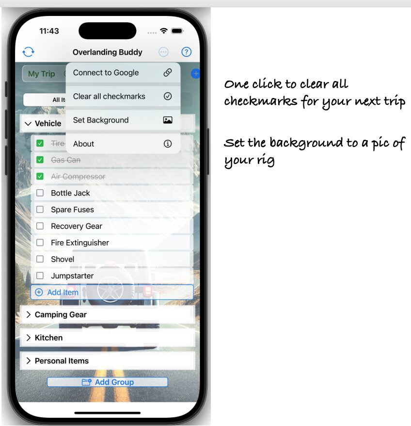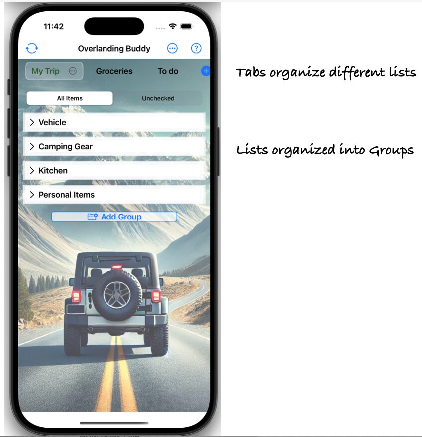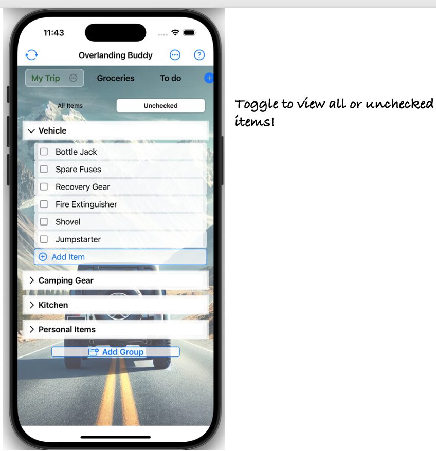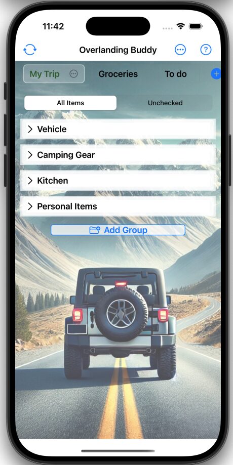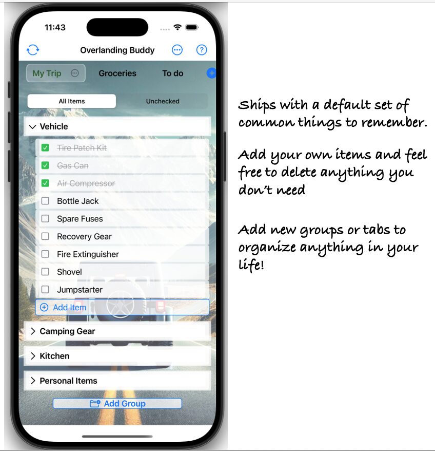 The app lets you create, manage, and share custom checklists tailored for your overlanding adventures. (Sharing coming soon!)